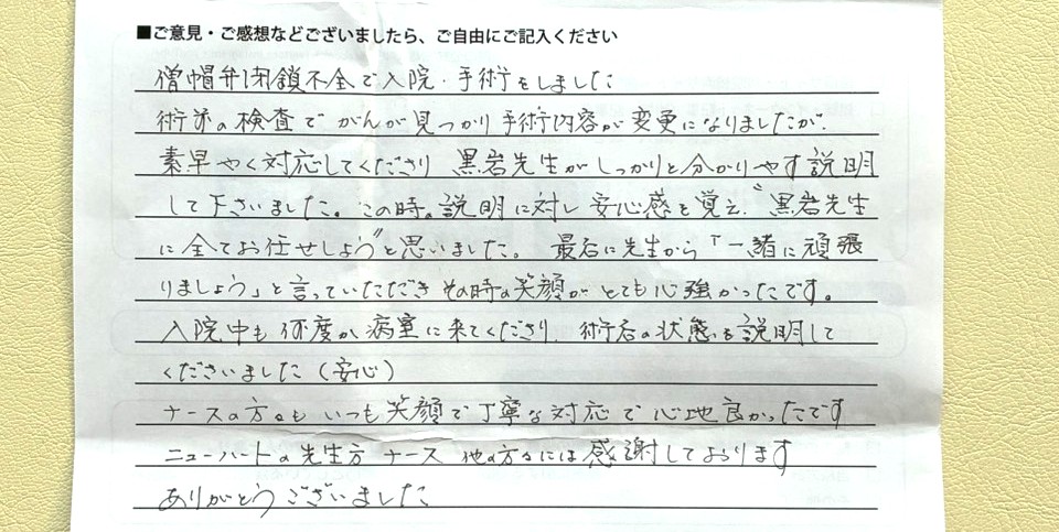 術前の検査でがんが見つかり、手術内容が変更になりましたが、素早く対応してくださり、黒岩先生がしっかりと分かりやすい説明をして下さいました。この時の説明に対し安心感を覚え、”黒岩先生に全てお任せしよう”と思いました。最後に先生から「一緒に頑張りましょう」と言っていただきその時の笑顔がとても心強かったです。