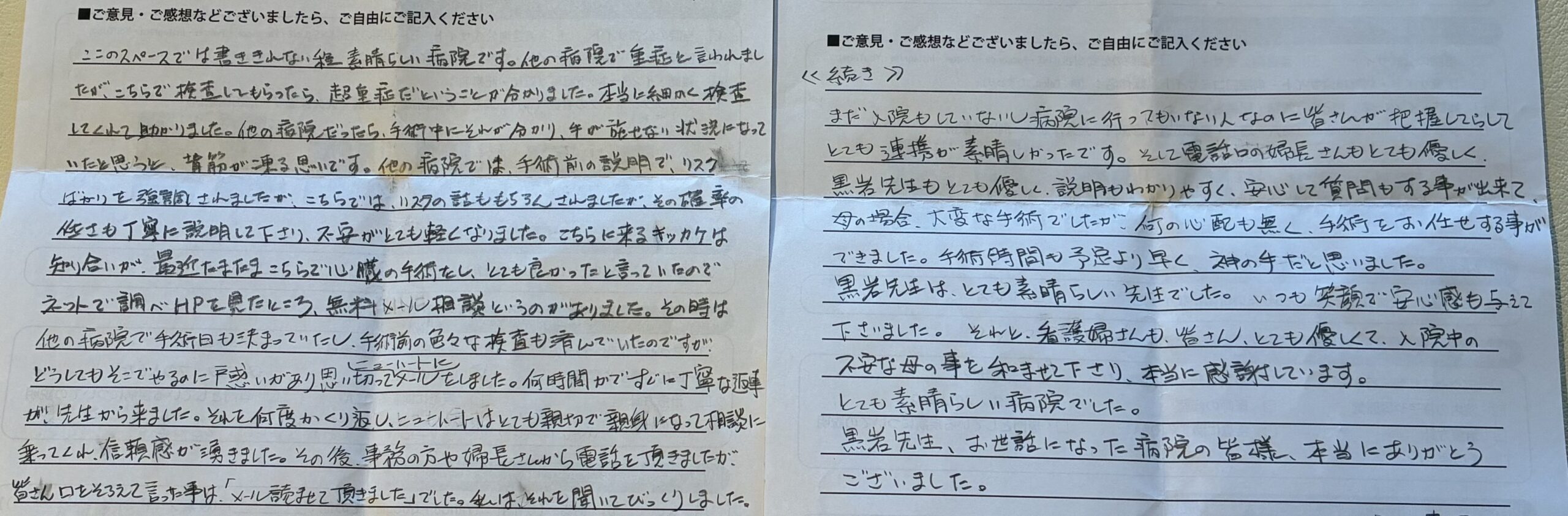 その後、事務の方や婦長さんから電話を頂きましたが、皆さん口をそろえて言った事は「メール読ませて頂きました」でした。私はそれを聞いてびっくりしました。まだ入院もしていないし、病院に行ってもいない人なのに、皆さんが把握してらして、とても連携が素晴しかったです。そして電話口の婦長さんもとてもやさしく、黒岩先生もとてもやさしく、説明もわかりやすく、安心して質問もする事が出来て、母の場合、大変な手術でしたが、何の心配も無く、手術をお任せする事ができました。手術時間も予定より早く、神の手だと思いました。