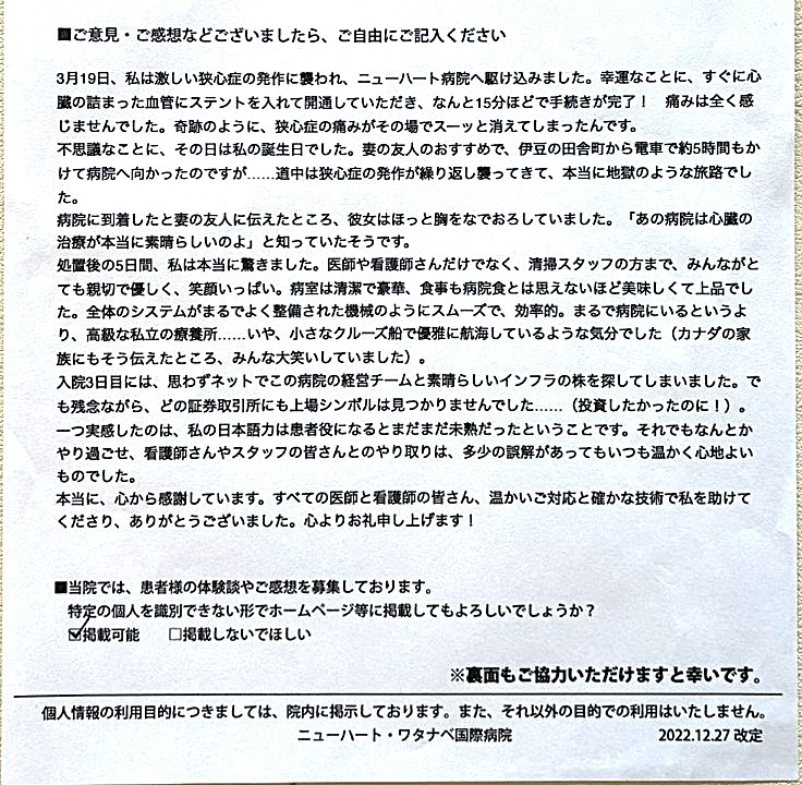 3月19日、私は激しい狭心症の発作に襲われ、ニューハート病院に駆け込みました。幸運なことに、すぐに心臓の詰まった血管にステントを入れて開通していただき、なんと15分程で手続きが完了!痛みは全く感じませんでした。奇跡のように、狭心症の痛みがその場でスーッと消えてしまったんです。